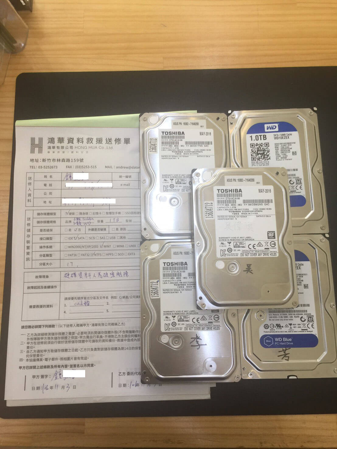 新竹 鐘先生,WD 1T (WD10EZEX)*2,TOSHIBA 1T(HDKPC32A7A01)*3 硬碟資料救援,