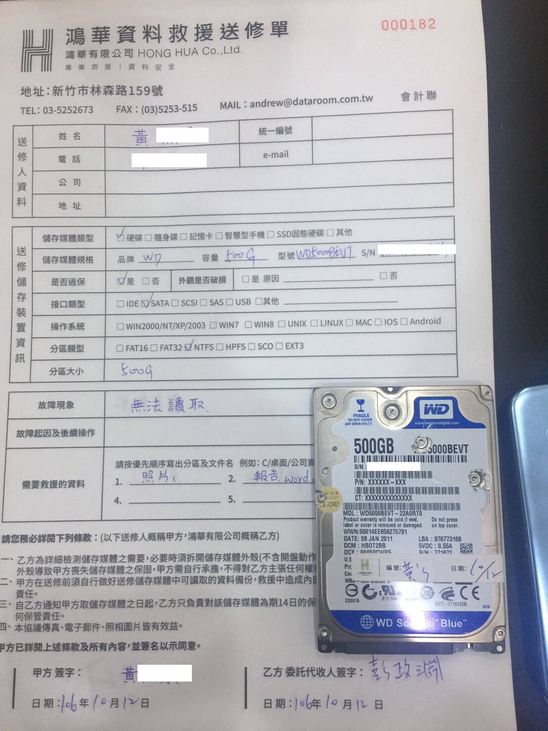 新竹 黃小姐,WD 500G (WD5000BEVT) 硬碟資料救援,